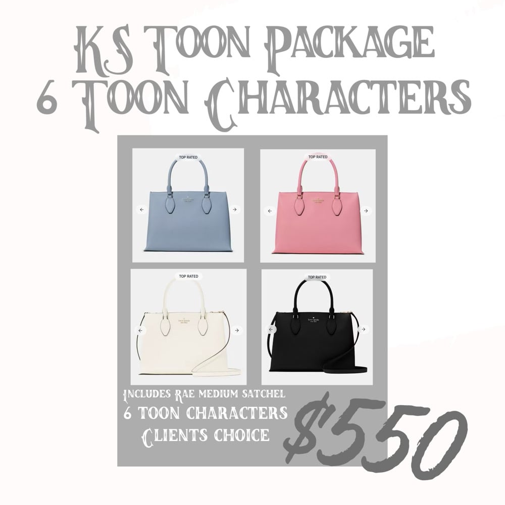 Package includes a Kate Spade Rae Medium Satchel and 6 toon characters of the clients choice